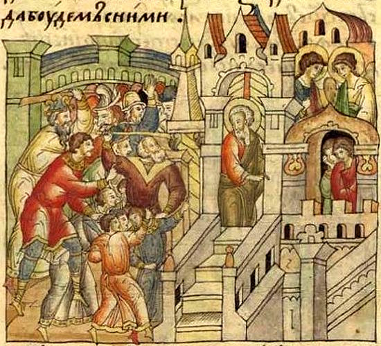 Лот с ангелами в Содоме. Летописный лицевой свод. XVI в.